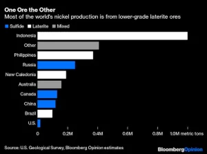 همانگونه که در تصویر زیر می‌بینید، بیشتر معادن نیکل دنیا، به شکل لاتریت (Laterit) است از آنها نیکل با خلوص پایین یا نیکل کلاس 2” استخراج می‌شود. این نوع نیکل در اندونزی و فیلیپین به وفور یافت می‌شود. اما روسیه دارای معادن نیکل سولفیدی با خلوص بالا (حدود 99.8%) است.