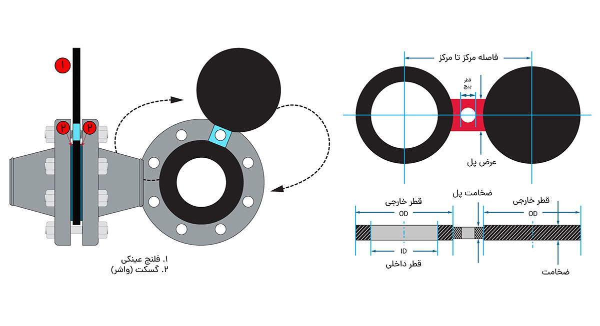 فلنج عینکی که معمولا با نامهای اسپکتیکال (Spectacle Blind Flange) و دابل بلایند (Double blind) نیز شناخته میشوند، از ترکیب دو دیسک فلزی تشکیل شدهاند. این دیسکها به گونهای به هم متصل شدهاند که شکل عدد ۸ انگلیسی هستند و معمولا یک شیار یا کانال در قسمت میانی آنها وجود دارد. یکی از دیسکها توپر است و برای مسدود کردن جریان بهکار میرود، در حالی که دیسک دیگر اجازه عبور جریان از طریق لوله را میدهد. فلنج عینکی از آلیاژهای مختلفی ساخته میشود، از جمله فولاد کربنی، استنلس استیل و آلیاژهای فلزی دیگر. ضخامت دیسک، قطر آن، و نوع فلز مورد استفاده بسته به اندازه لوله، فشار، دما و خواص سیال تعیین میشود.