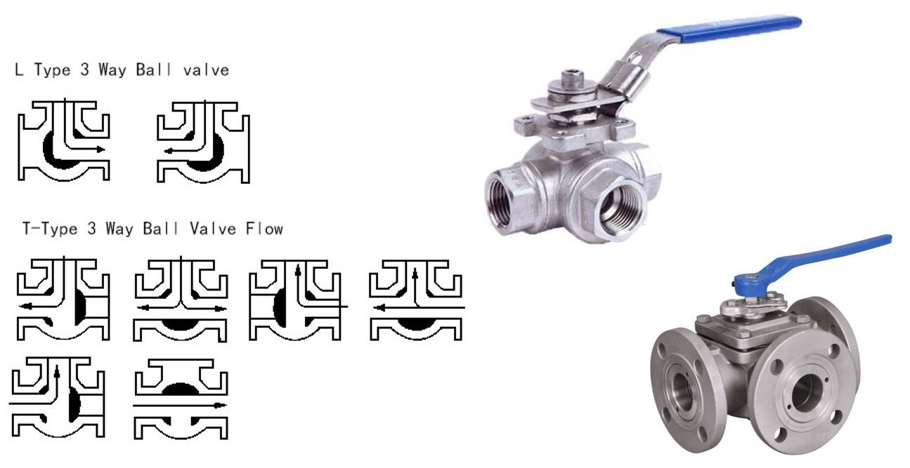 • شیر توپی استیل سه راهی (Three-Way Ball Valve): این نوع شیر توپی دارای یک درگاه ورودی و یک درگاه خروجی و یا یک درگاه ورودی و دو درگاه خروجی است. علاوه بر این می‌توان با استفاده از این شیر، یکی از مسیرها را مسدود کرد. این نوع شیرهای توپی سه راهه معمولا به صورت L و T تولید می‌شوند.