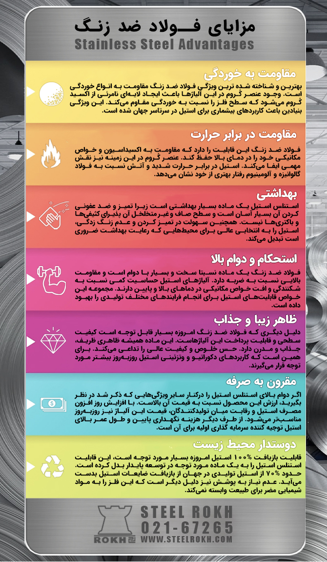 در این مطلب، با مزایای فولاد ضد زنگ آشنا شدید. جموعه استیل رخ با سال‌ها تجربه در تامین مواد اولیه و خدمات استنلس استیل آماده همکاری و پشتیبانی صنعتگران در این زمینه است. برای تامین ورق استیل، لوله استیل و پروفیل استیل و انواع مقاطع توپر استیل آمادگی داریم در خدمت شما باشیم. همچنین برای تامین اتصالات صنعتی استیل و انواع یراق و اتصالات دکوراتیو استیل می‌توانید به فروشگاه آنلاین ما سری بزنید. استیل رخ آمادگی دارد با ارائه خدمات فنی و تکمیلی استیل نیز در خدمت شما باشد و شما را به محصول نهایی مورد نظرتا نزدیک‌تر کند. برای مشاوره و تامین کالا و خدمات استیل با کارشناسان استیل رخ در تماس باشید.