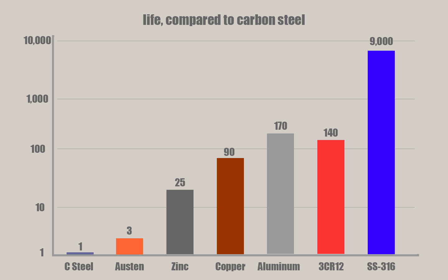 بر طبق نتایج این مطالعه، ورق استیل 316 (SS – 316) حدود 9 هزار برابر نسبت به فولاد کربنی (C steel) عمر میکند. البته، لایه غیرفعال که فولاد ضد زنگ برای محافظت به آن متکی است باید اجازه شکل گیری دوباره و ترمیم خود را داشته باشد. اکسیدهای آبی و مشکی قابل مشاهده که در طی عملیات حرارتی، جوشکاری و سنگ زنی تشکیل میشوند، در ایجاد لایه غیرفعال اختلال ایجاد میکنند. این اکسیدها باید پاکسازی شوند تا مقاومت به خوردگی ورق استیل افزایش یابد.