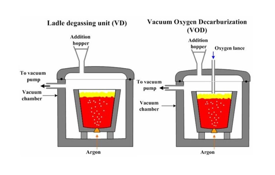 کوره VOD چیست؟ Vacuum Oxygen Decarburization یکی از مهم‌ترین کوره‌های مورد استفاده در فرآیند تولید استنلس استیل است. این کوره‌ها برای گاز زدایی و کربن ‌زدایی مذاب استفاده می‌شود. در متالورژی برای کربن زدایی در فولادها از گاز اکسیژن استفاده می‌‌شود. دمیدن گاز اکسیژن سبب می‌شود تا کربن موجود در فولاد با اکسیژن ترکیب شود و به صورت گاز CO2 از مذاب خارج شود. در این مرحله می‌توان کربن موجود در مذاب را تا حدود 0.015 % کاهش داد. در ابتدا با دمیدن اکسیژن سیلیکون زدایی رخ می‌دهد و پس از آن کربن زدایی آغاز می‌شود.
