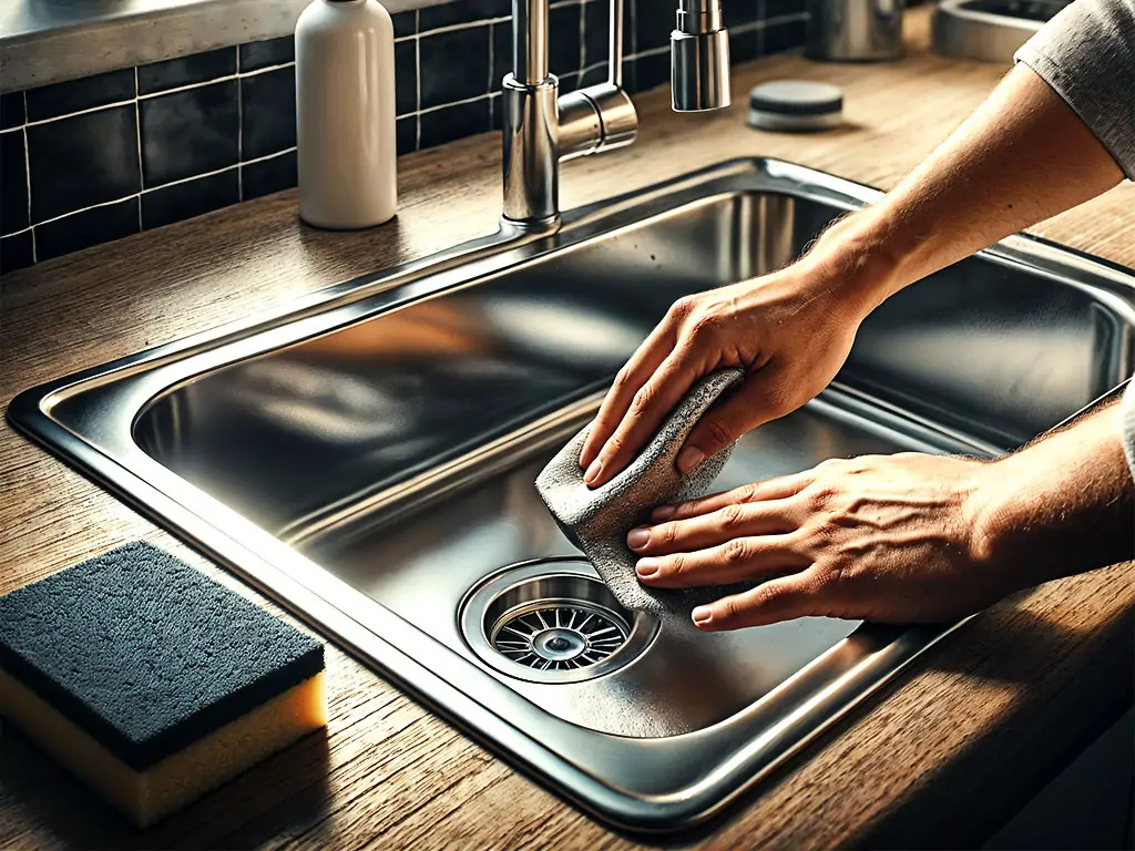 - تمیز کردن سطح سینک: در ابتدا باید سطح سینک را از هرگونه آلودگی، گرد و غبار، چربی و … تمیز کنید و پس از آن باید سطح سینک را پولیش بزنید.