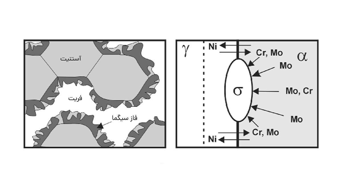 در طی عملیات حرارتی یا جوشکاری، فاز فریتی بهصورت موضعی در تماس با آستنیت قرار دارد. اتمهای کروم و مولیبدن تمایل به نفوذ به مرز مشترک دارند و در دماهای متوسط، با آهن ترکیب شده و فاز σ را تشکیل میدهند. این واکنش بهشدت وابسته به زمان است. بهعنوان مثال، در استیل 316L در دمای 800 درجه سانتیگراد، سیگما میتواند در کمتر از ۲ ساعت تشکیل شود، در حالیکه در دمای 700 درجه سانتیگراد ممکن است چند روز طول بکشد.