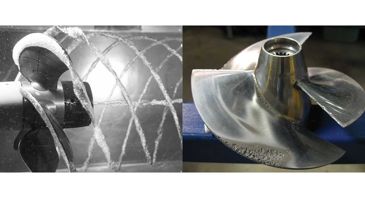اثر کاویتاسیون بر توربینها (حبابها در شکل سمت چپ قابل مشاهده هستند)