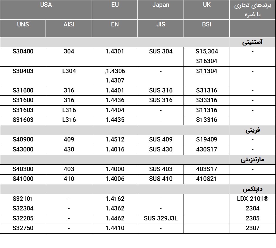 نمونهای از گرید معادل فولادهای ضد زنگ و CRA