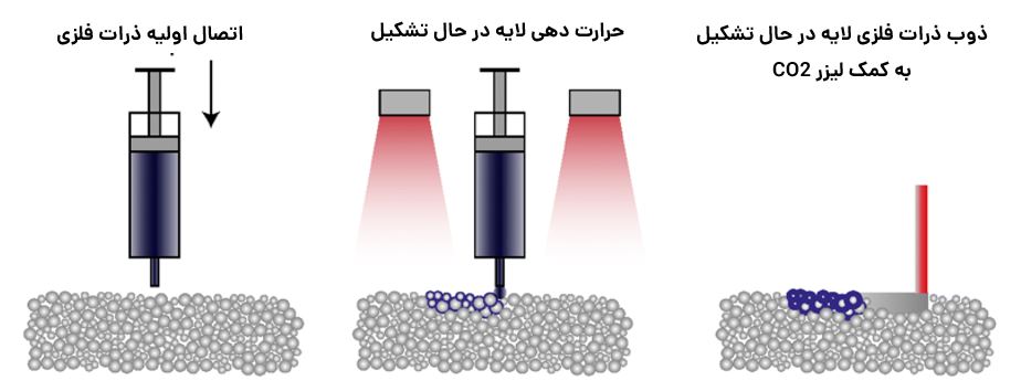 در مرحله اول یک لایه نازک از پودر استیل در داخل محفظه پخش میشود. سپس به کمک نازلهای بسیار ظریفی بایندر ذرات فلزی را به هم میچسباسند و به کمک حرارت تثبیت میشوند. پس از آن دمای این پودر تا زیر دمای ذوب آن بالا میرود تا فرآیند زینترینگ یا تفجوشی به راحتی انجام شود. این افزایش دما به کمک پرتو لیزر انجام میشود. پس از آن خنک سازی انجام میشود تا ضمن بهبود خواص مکانیکی قطعه تولید شده، برای تشکیل لایه بعدی پودر فلز لایه گذاری شود. پس از اجرای تمام لایهها در مرحله آخر قطعه را از محفظه خارج و آن را تمیز میکنند.