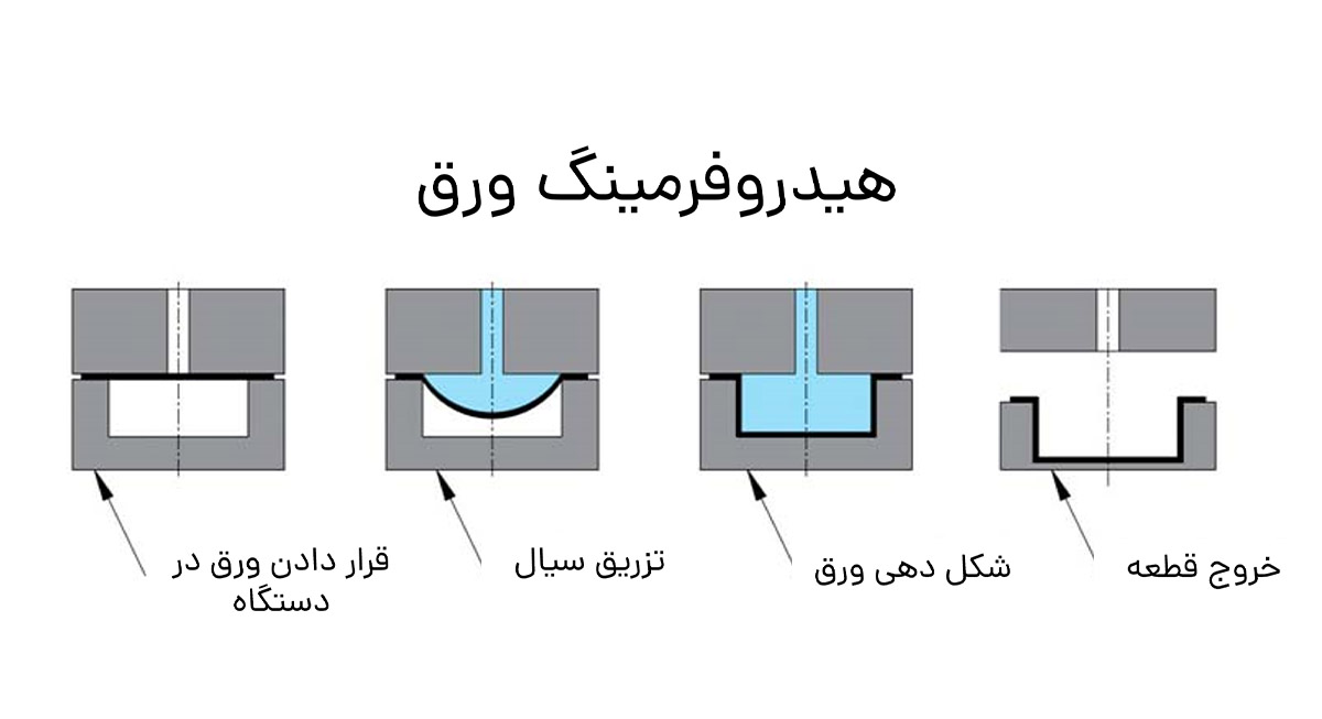 هیدروفرمینگ لوله و ورق تفاوت زیادی ندارند. اصول کار برای هردو یکسان است و تنها در جزئیات و طراحی قالبها با یکدگیر متقاوت هستند. در ادامه هیدروفرمینگ ورق را توضیح میدهیم.