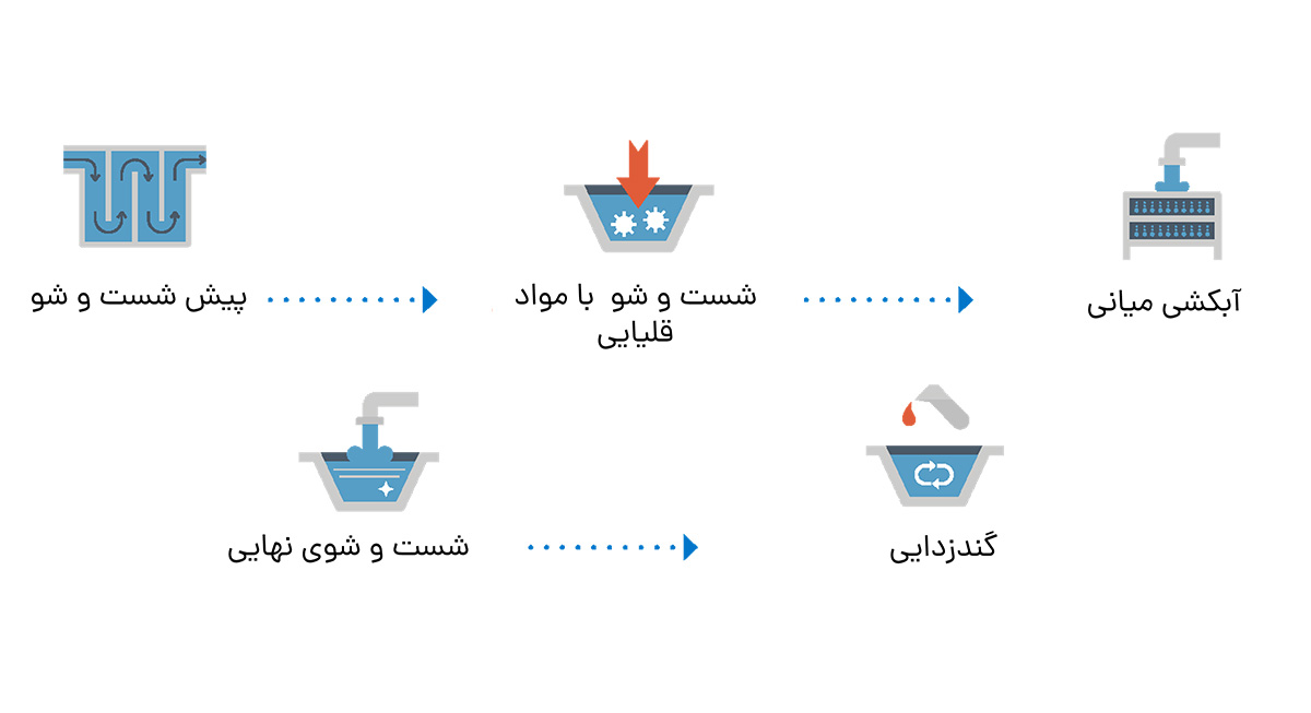• آبکشی نهایی: در این مرحله از سیستم CIP در صنایع غذایی با استفاده از آب دیونیره یا آب شهری، باقی‌مانده‌های مواد شوینده و شیمیایی حذف می‌شوند. در بسیاری از سیستم‌ها، این آب می‌تواند به عنوان محلول مرحله اول، یعنی پیش شست‌و‌شو، در چرخه بعدی مورد استفاده قرار گیرد.