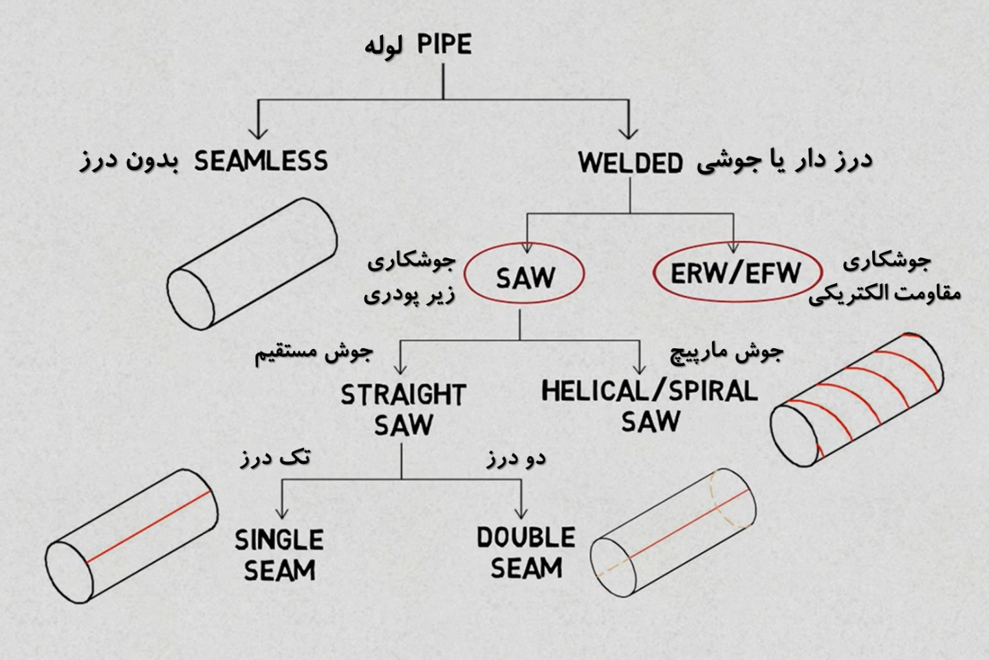 بهطورکلی مشخصات لوله را بر اساس روش ساخت آنها میتوان به دو نوع اصلی درزدار (Welded) و بدون درز (Seamless) تقسیمبندی کرد. لولههای درزدار یا جوشی را نیز بر طبق نوع جوش به کار رفته در آنها دستهبندی میکنند. دو روش اصلی برای جوشدادن لولهها عبارتند از: جوش لوله با فلز پرکننده (SAW) و جوش لوله بدون فلز پُرکننده یا جوشکاری مقاومت الکتریکی (ERW/EFW) است. همچنین لولههای جوشی در دو نوع لولههای درز مستقیم و درز مارپیچی نیز طبقهبندی میشوند. از طرف دیکر لولههای جوشی درزمستقیم با قطر کمتر دارای یک درز و لولههای جوشی بزرگ دارای دو درز جوش هستند.