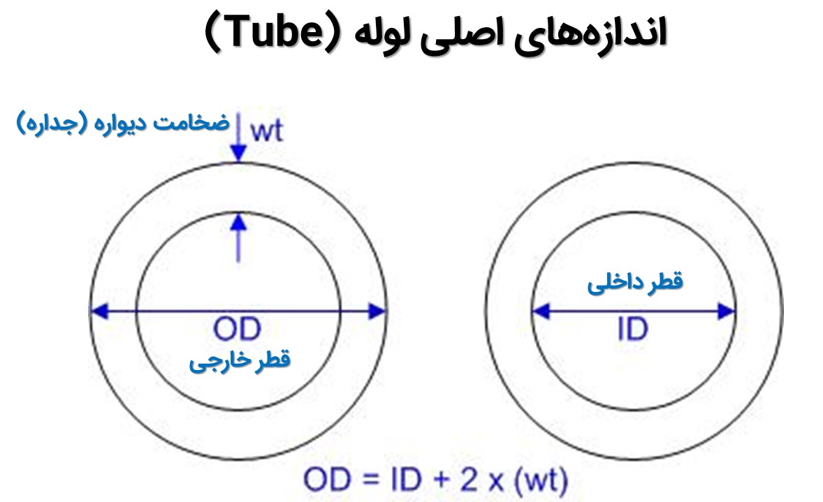 - قطر داخلی لوله را میتوان با کم کردن 2 برابری ضخامت دیواره از قطرخارجی لوله به دست آورد. ضخامت دیواره (WT) را میتوان از رده لوله و طبق جداول مشخصات بدست آورد. (کلاس و مشخصات لوله صنعتی چیست؟)