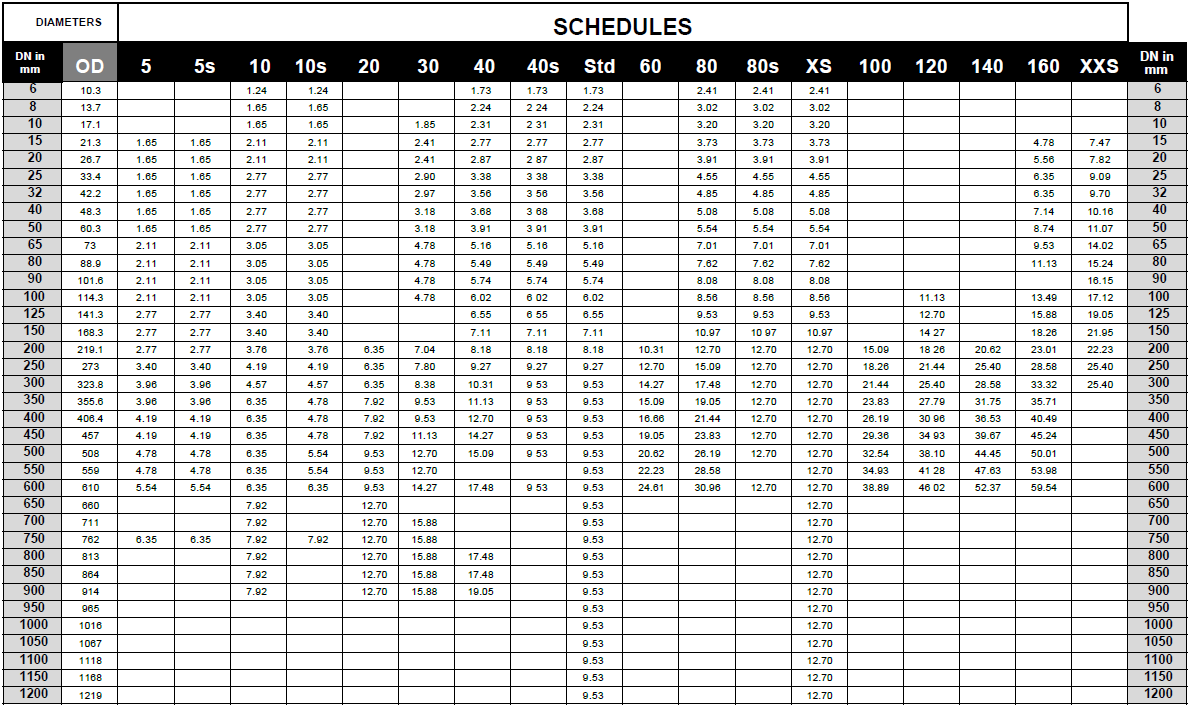لیست ردههای لوله که امروزه مورد استفاده قرار میگیرند عبارتند از: 5، 5S، 10، 10S، 20، 30، 40، 40S، 60، 80، 80S، 100، 120، 140، 160، STD، XS و XXS . در ادامه نمونه جدول میلیمتری اندازه لوله را مشاهده میکنید.